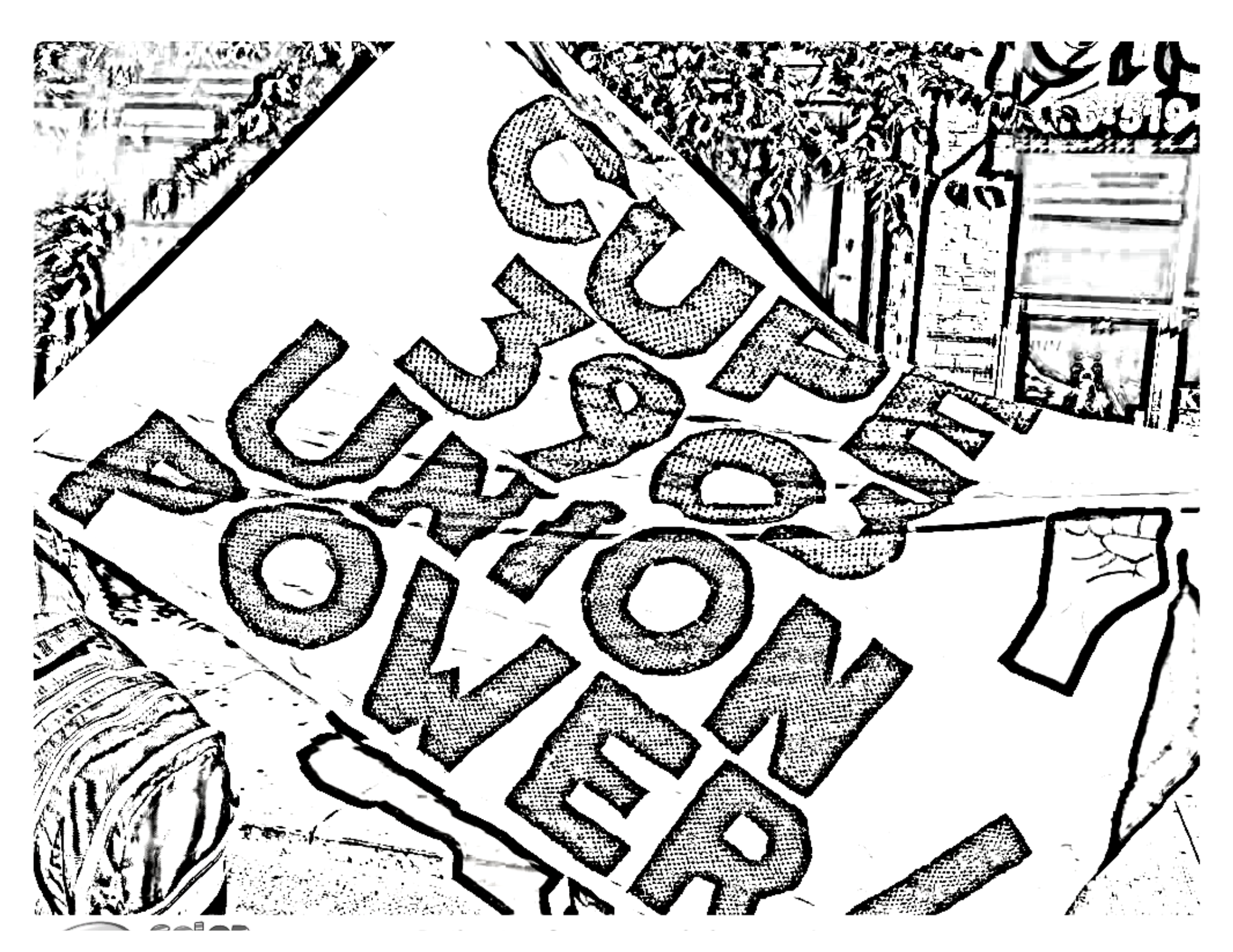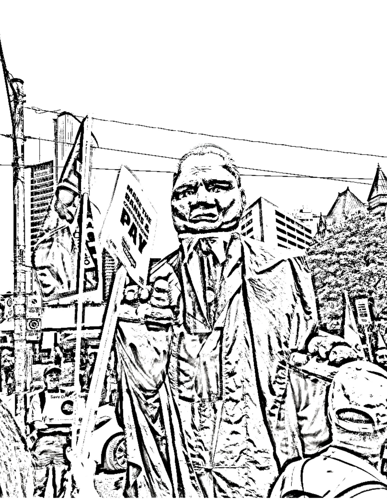 - A large Doug Ford puppet with a protest sign reading “Make the Banks & Corporations Pay”